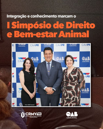 Nos dias 17 e 18 de setembro, Cascavel recebeu o I Simpósio Interdisciplinar de Direito e Bem-estar Animal, promovido pelo CRMV-PR, por meio da Comissão de Medicina Veterinária de Pequenos Animais e da Comissão de Ética na Publicidade Veterinária e Zootecnia, em parceria com a Comissão de Direito dos Animais da OAB Cascavel.