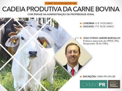 O CRMV-PR promoverá um Curso de Atualização na Cadeia Produtiva de Carne Bovina nas cidades de Londrina e Cascavel com o objetivo de capacitar médicos veterinários e zootecnistas na área de administração da propriedade rural.