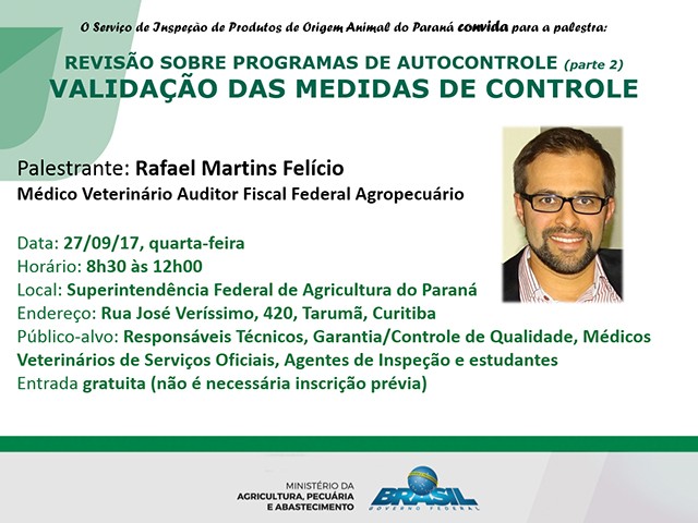 A Superintendência Federal de Agricultura no Paraná realizará nesta quarta-feira (27), às 8h30, em Curitiba, a segunda edição da palestra “Revisão sobre programas de autocontrole”. Desta vez o auditor fiscal federal agropecuário Rafael Martins Felício abordará a validação das medidas de controle. O evento é gratuito e não é necessário fazer inscrição prévia.