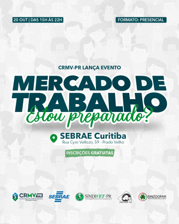 O CRMV-PR convida acadêmicos e profissionais de Medicina Veterinária e de Zootecnia a participarem do evento “Mercado de trabalho: Estou preparado?”, que será realizado no dia 20 de outubro, das 15h às 22h, no Sebrae Curitiba.
