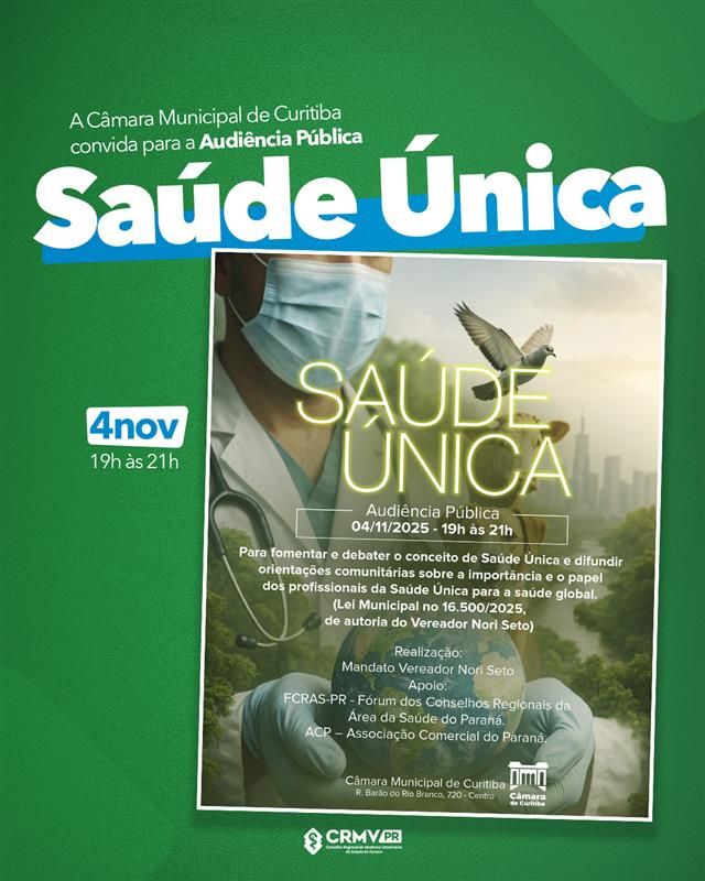 A Câmara Municipal de Curitiba convida para a Audiência Pública “Saúde Única: para preservar e manter a saúde global”, que integra a 1ª Campanha de Promoção do Conceito e dos Profissionais da Saúde Única em Curitiba
