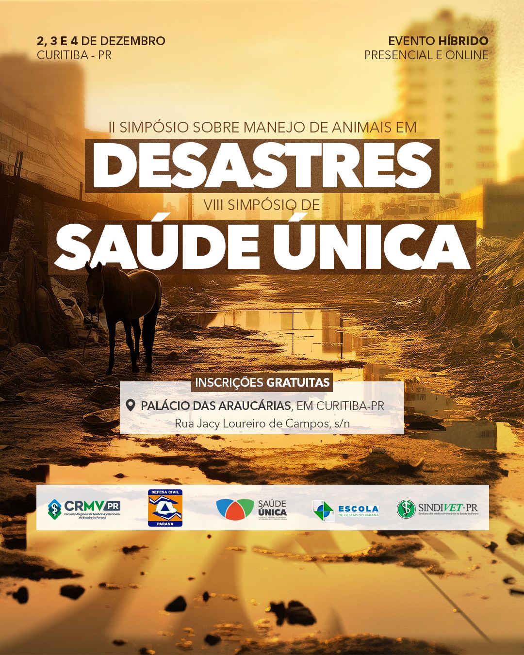 O Conselho Regional de Medicina Veterinária do Paraná (CRMV-PR), por meio da Comissão Estadual de Gestão de Riscos de Animais em Desastres, Comissão Estadual de Saúde Única e Comissão Estadual de Animais Selvagens , em parceria com a Coordenadoria Estadual da Defesa Civil, realizará, nos dias 02, 03 e 04 de dezembro, II Simpósio sobre Manejo de Animais em Desastres e VIII Simpósio de Saúde Única.