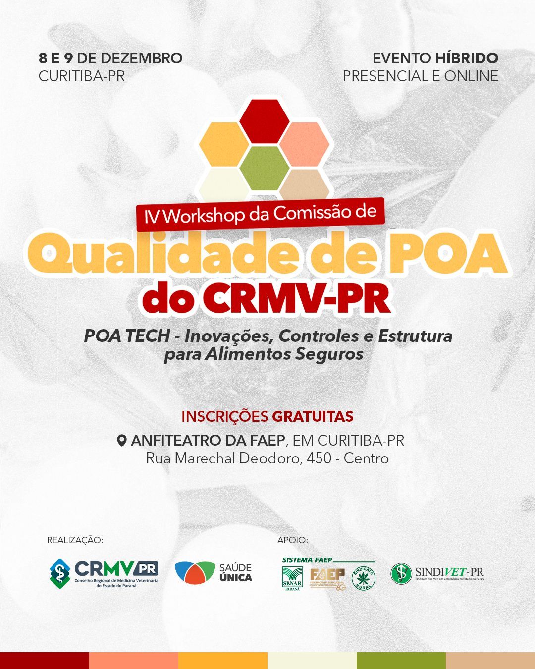 O Conselho Regional de Medicina Veterinária do Paraná (CRMV-PR), por meio da Comissão de Qualidade dos Produtos de Origem Animal, realizará, nos dias 8 e 9 de dezembro, o IV Workshop da Comissão de Qualidade de POA do CRMV-PR. O evento acontecerá no anfiteatro da FAEP, em Curitiba, com transmissão ao vivo para os participantes inscritos.